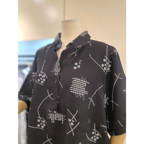 카라넥에 버튼은 증간까지 있습니다. 세탁도 쉽고 구김이 심하지 않습니다.