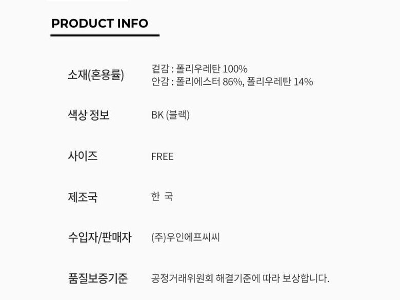 재질 : 겉감 폴리우레탄 100 안감 폴리에스터 86 폴리우레탄 14