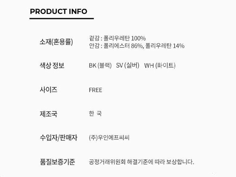 재질 : 겉감 폴리우레탄 100 안감 폴리에스터 86 폴리우레탄 14