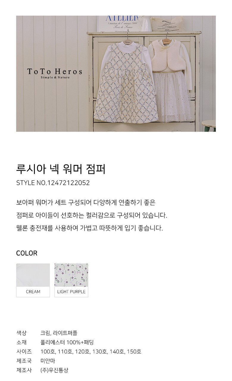 | 1. 제품 소재 (섬유의 조성 또는 혼용률을 백분율로 표시, 기능성인 경우 성적서 또는 허가서) | 폴리에스터 100%+패딩 |