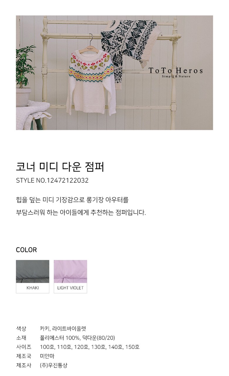 1. 제품 소재 (섬유의 조성 또는 혼용률을 백분율로 표시, 기능성인 경우 성적서 또는 허가서) | 폴리에스터 100%+덕다운(80/20) |