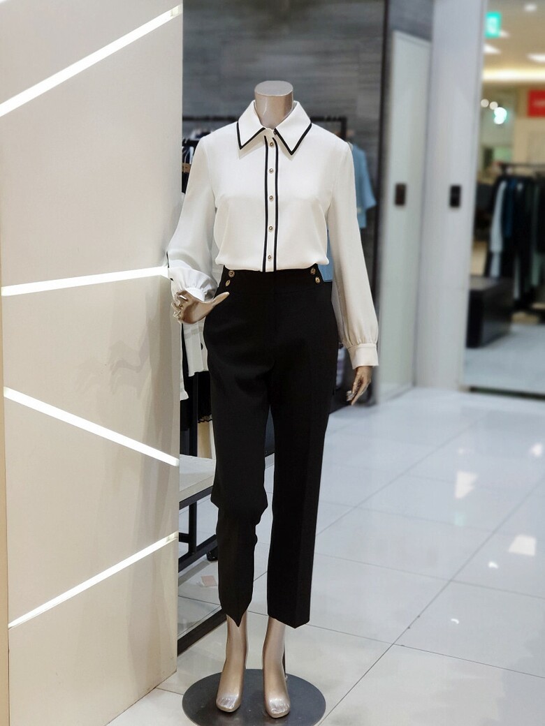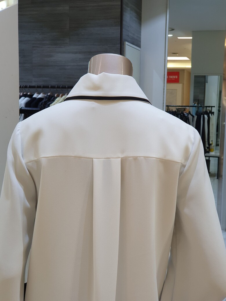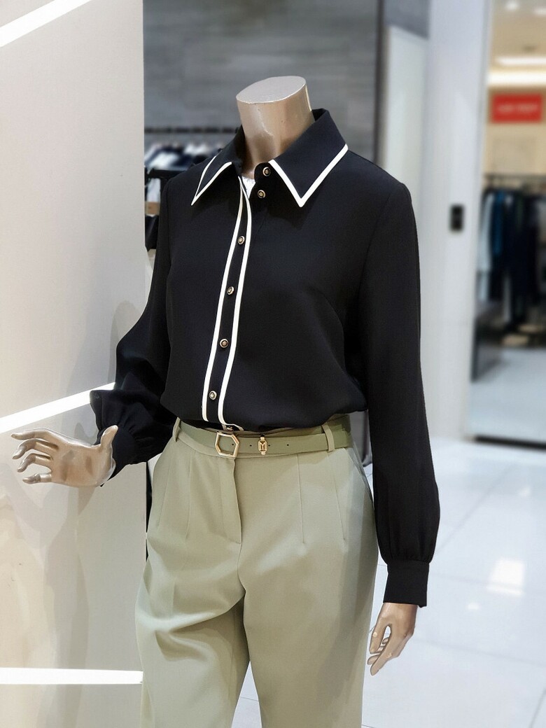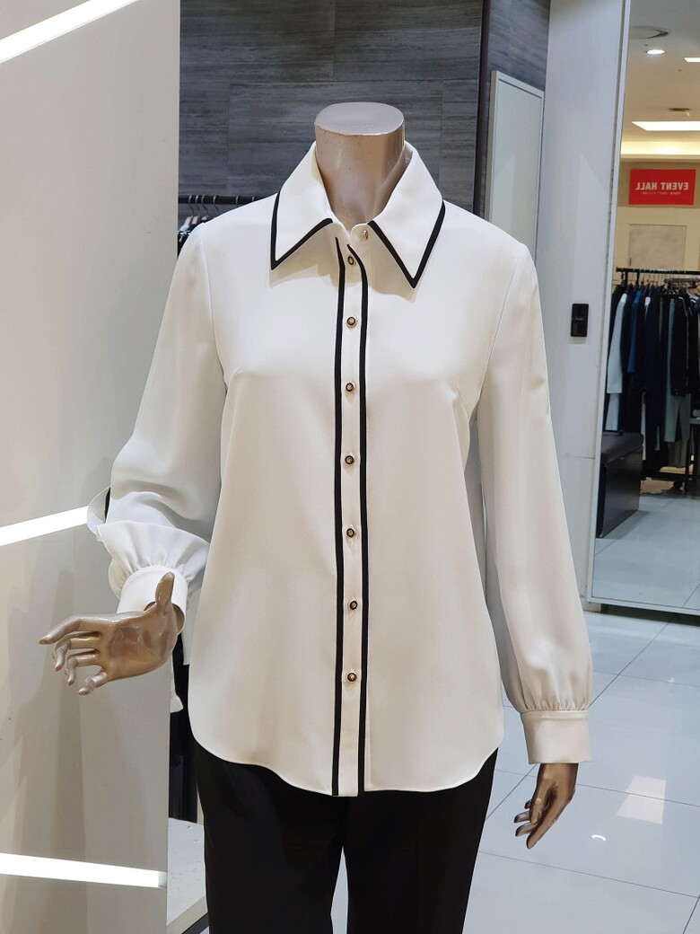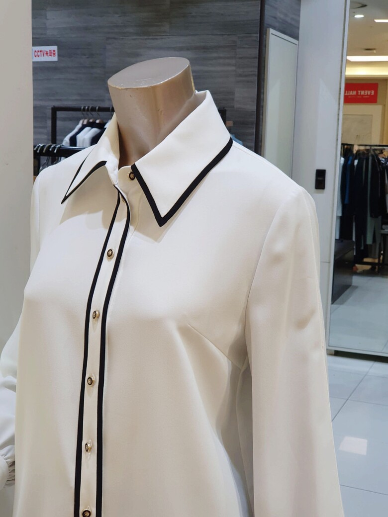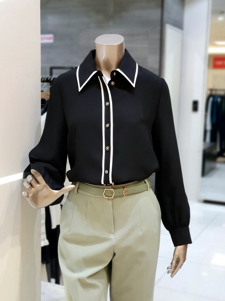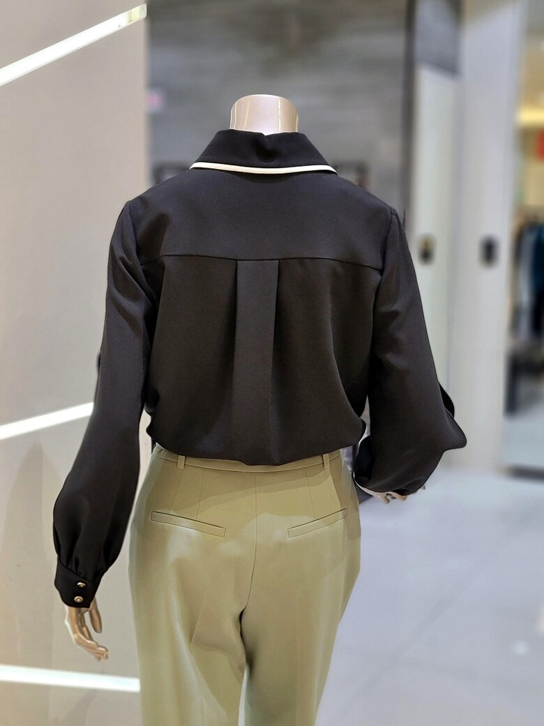 칼라에서 프런트로 이어지는 배색이 포인트가 되는 블라우스입니다.