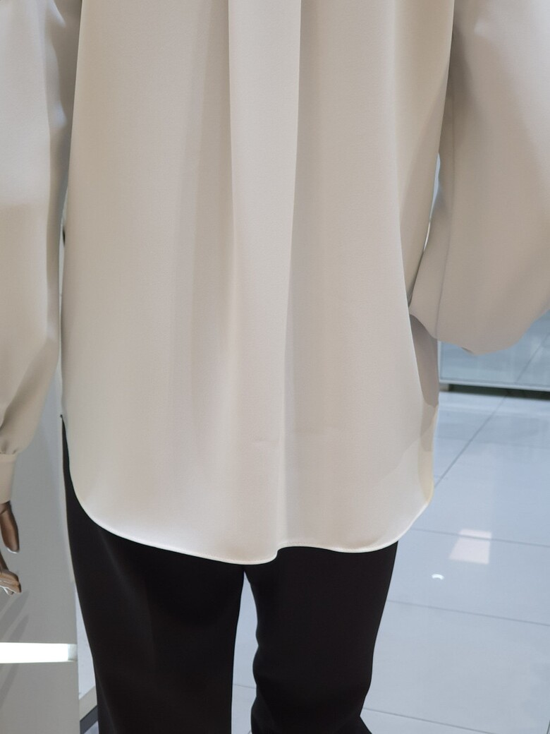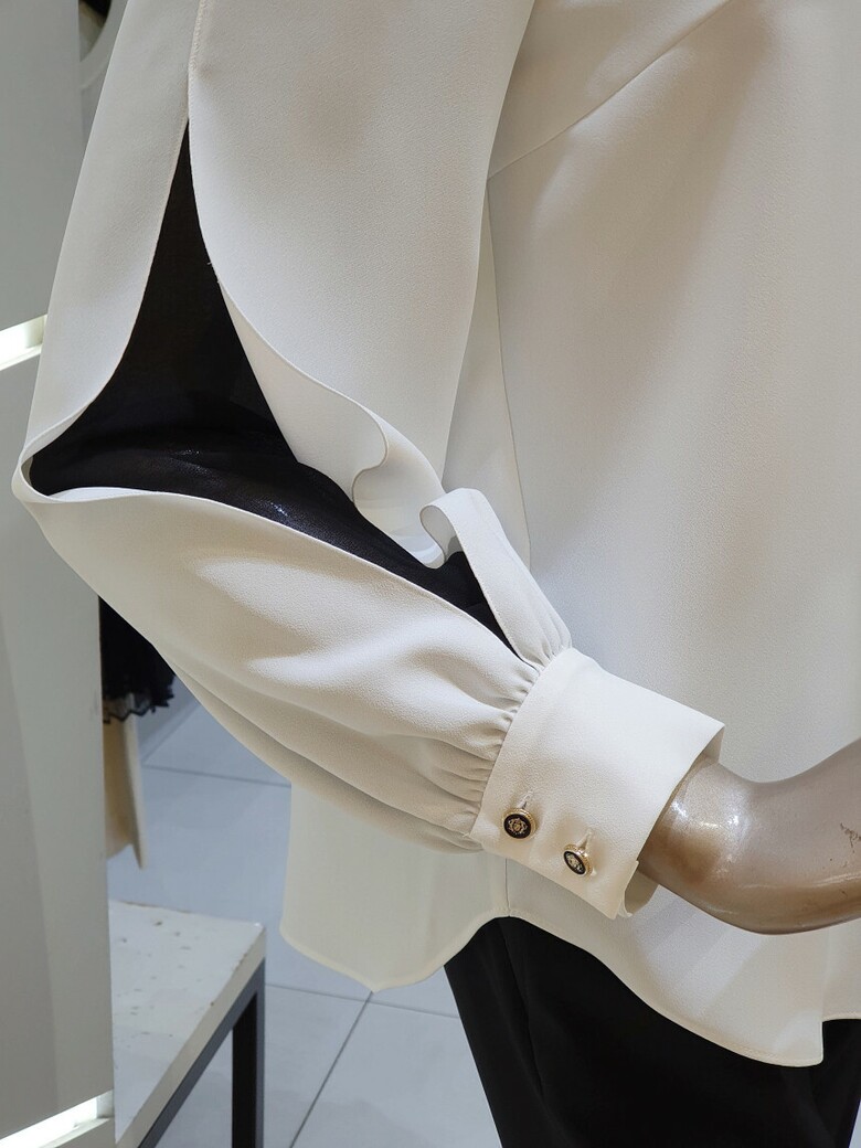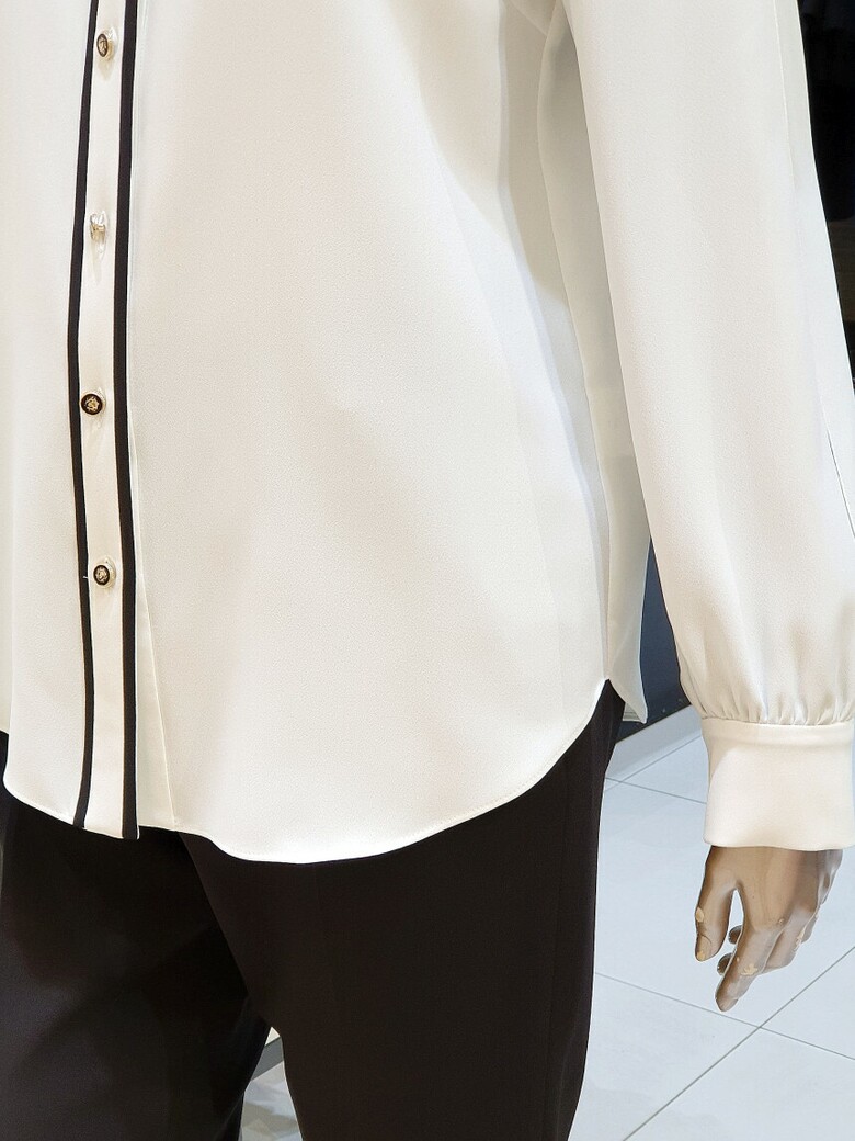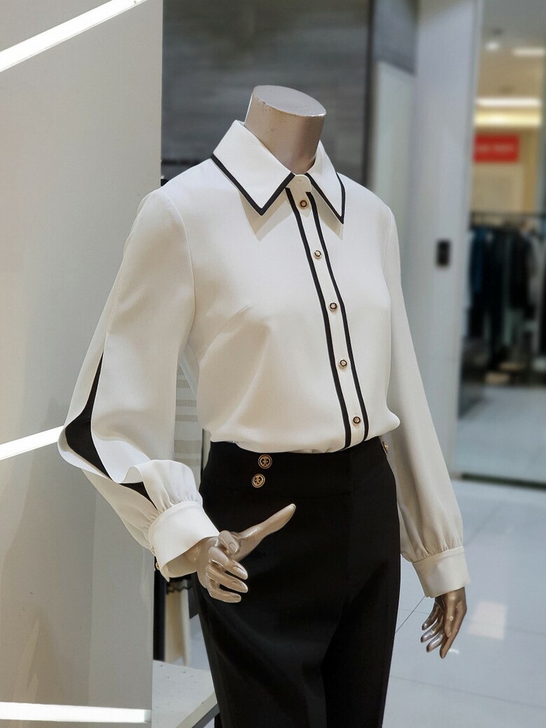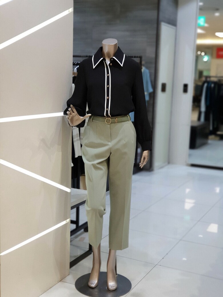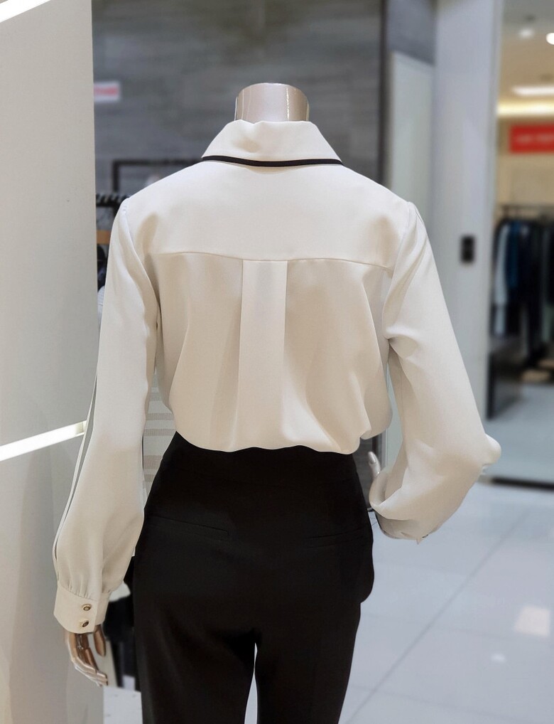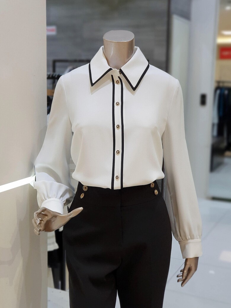 칼라에서 프런트로 이어지는 배색이 포인트가 되는 블라우스입니다.