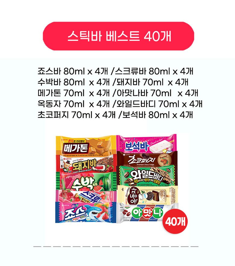 [롯데] 스틱바 혼합 10종 40개세트 (죠스 4+스크류 4+수박 4+돼지바 4 외)