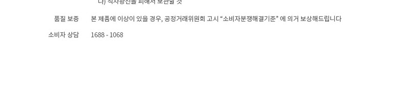 상품불량에 의한 반품, A/S, 품질보증 및 피해보상 등에 관한 사항은 소비자 분쟁해결기준(공정거래위원회 고시) 구매자가 미성년자인 경우에는 상품 구입시 법정대리인이 동의하지 아니하면 미성년자 본인 또는 법정대리인이 구매취소 할 수 있습니다. |
