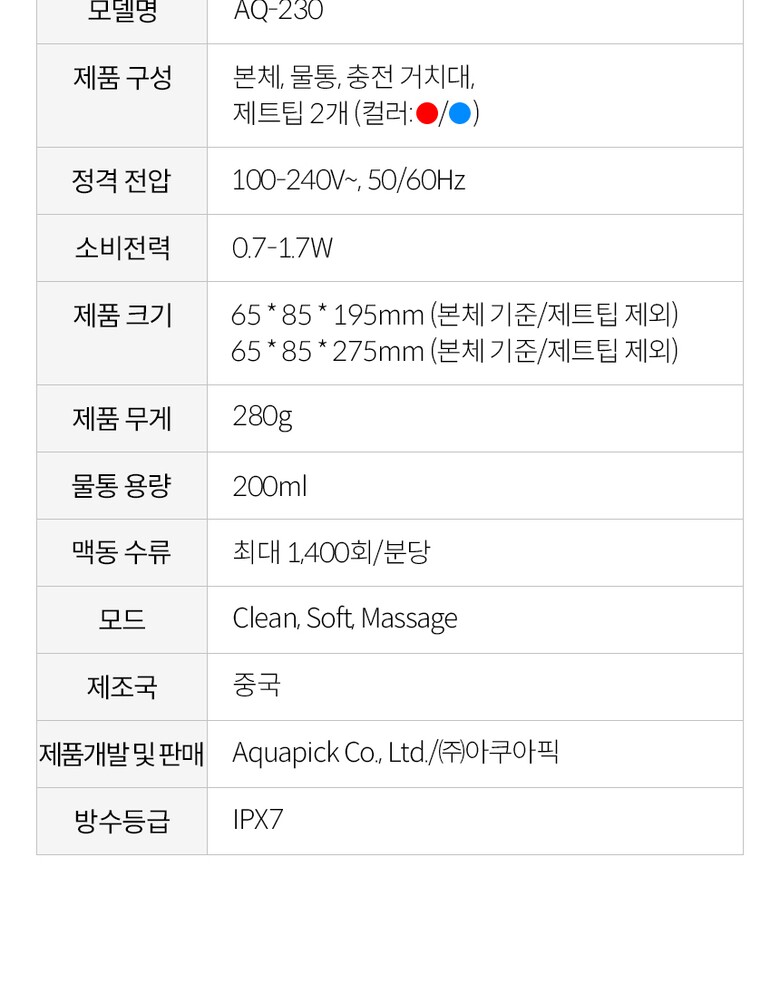 1. 모델명(품번) | 아쿠아픽 코드리스 무선 구강세정기 AQ-230 |