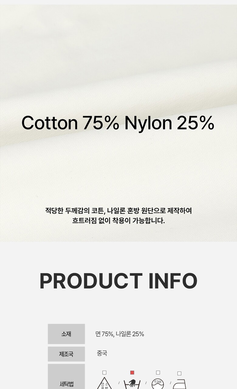 1. 제품 소재 (섬유의 조성 또는 혼용률을 백분율로 표시, 기능성인 경우 성적서 또는 허가서) | 면75%, 나일론25% |