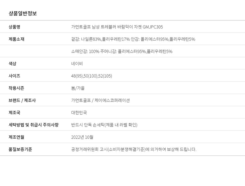 | 1. 제품 소재 (섬유의 조성 또는 혼용률을 백분율로 표시, 기능성인 경우 성적서 또는 허가서) | 겉감: 나일론83%,폴리우레탄17% 안감: 폴리에스터95%,폴리우레탄5% 소매안감: 100% 주머니감: 폴리에스터95%,폴리우레탄5% |