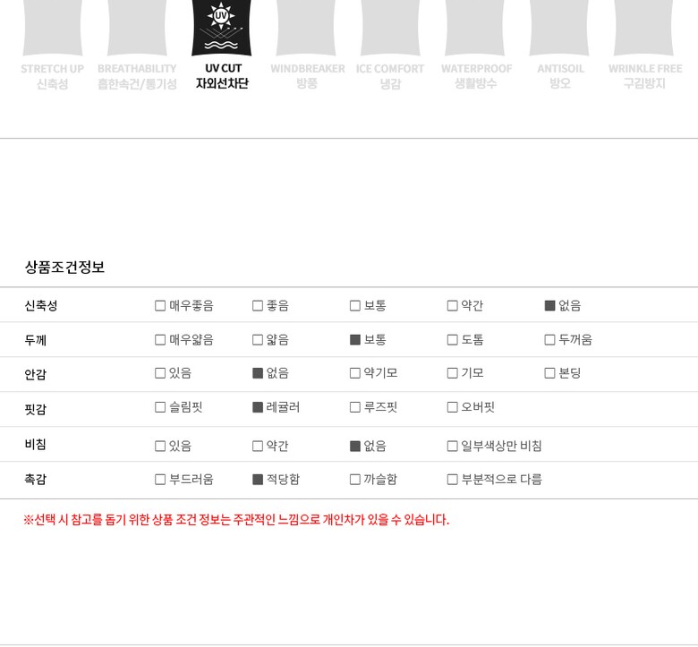 1. 제품 소재 (섬유의 조성 또는 혼용률을 백분율로 표시, 기능성인 경우 성적서 또는 허가서) | 겉감: 폴리에스터100% 안감1: 폴리에스터94%,폴리우레탄6% 안감2: 폴리에스터100% 배색: 레이온96%,스판4% |
