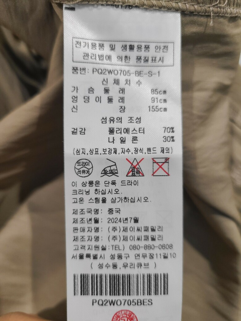 1. 제품 소재 (섬유의 조성 또는 혼용률을 백분율로 표시, 기능성인 경우 성적서 또는 허가서) 겉감:폴리에스테르 70%, 나일론 30%