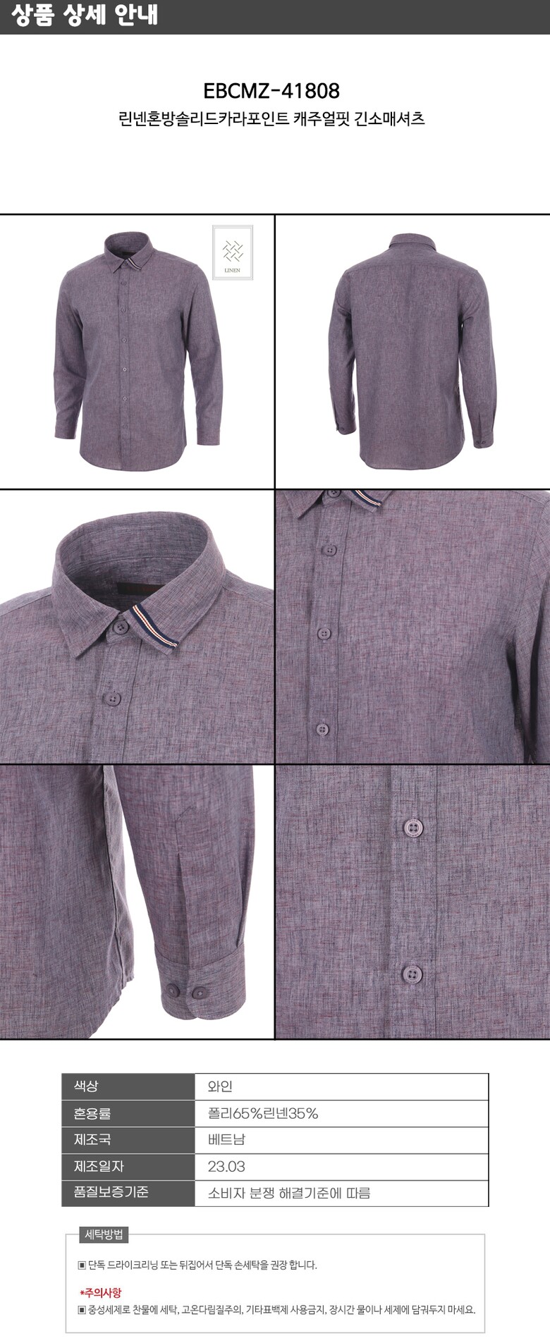 엘르 남성 린넨혼방솔리드카라포인트 캐주얼핏 긴소매셔츠 41808