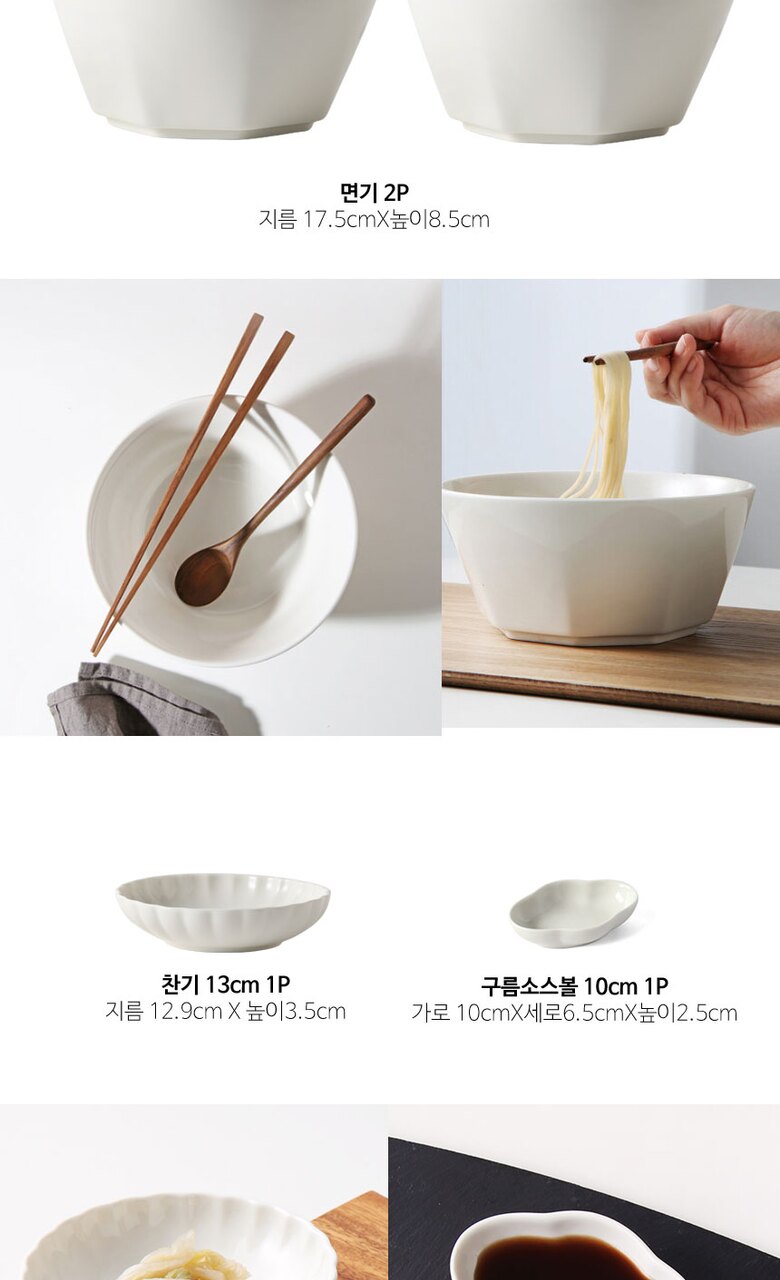 3. 구성품 | 면기 2p,접시 17cm(7인치) 1p, 찬기 12.5cm 1p, 구름소스볼 1p |