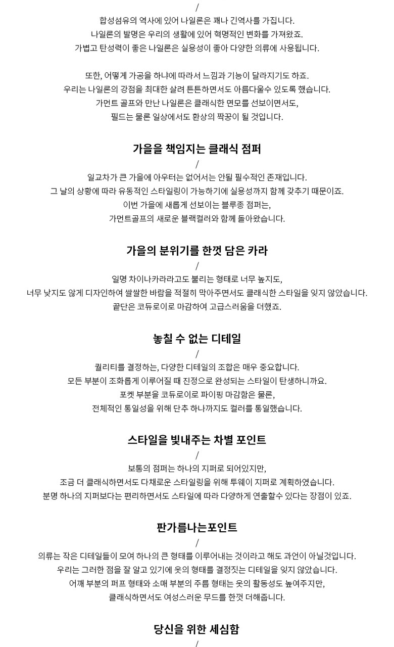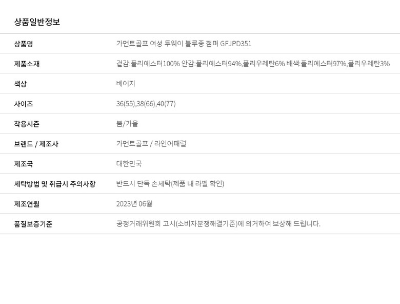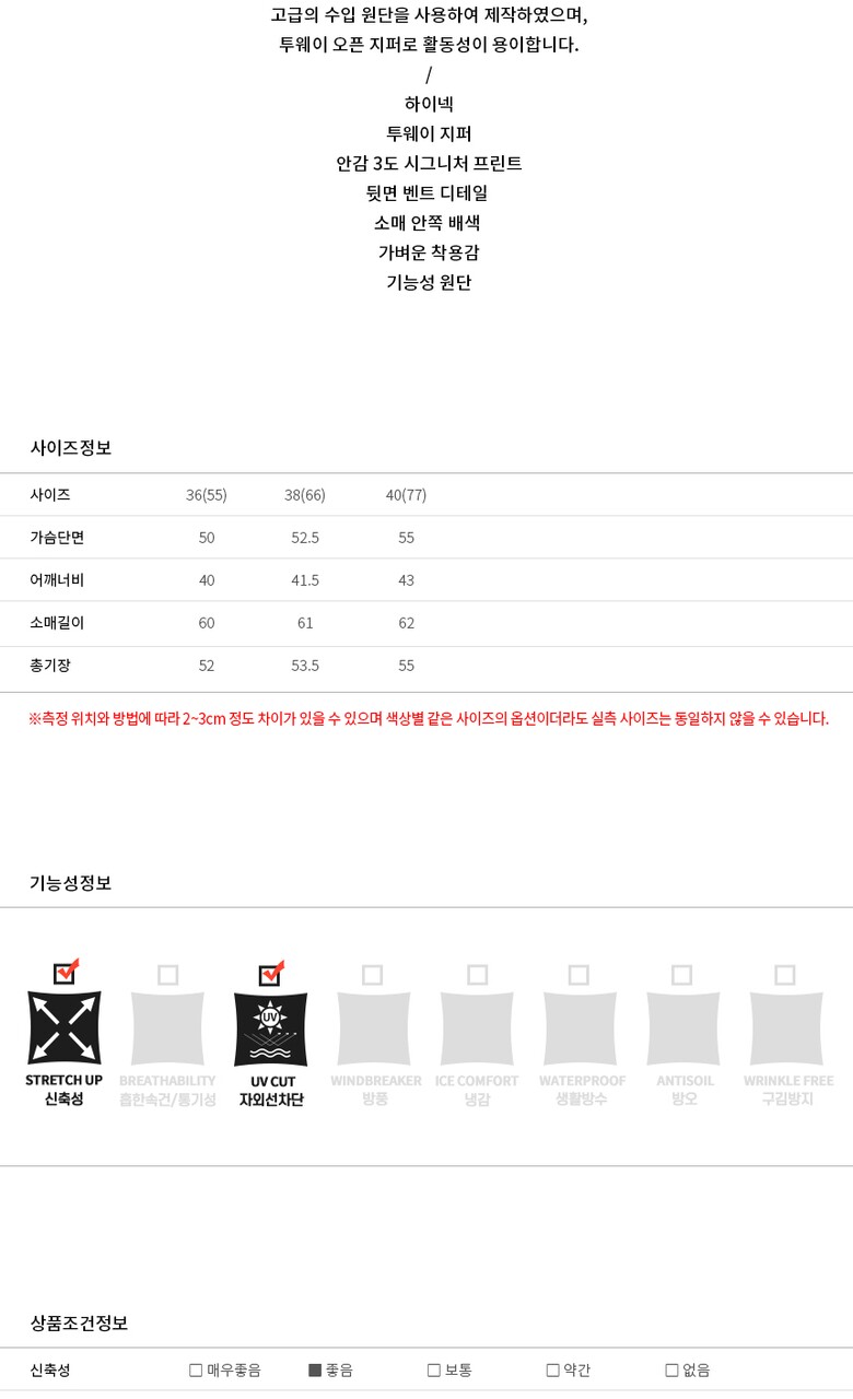 1. 제품 소재 (섬유의 조성 또는 혼용률을 백분율로 표시, 기능성인 경우 성적서 또는 허가서) | 겉감:폴리에스터100% 안감:폴리에스터94%,폴리우레탄6% 배색:폴리에스터97%,폴리우레탄3% |
