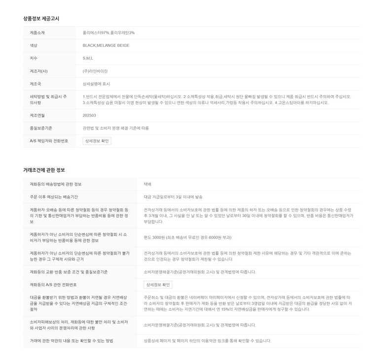 | 1. 제품 소재 (섬유의 조성 또는 혼용률을 백분율로 표시, 기능성인 경우 성적서 또는 허가서) | 상품상세참조 |