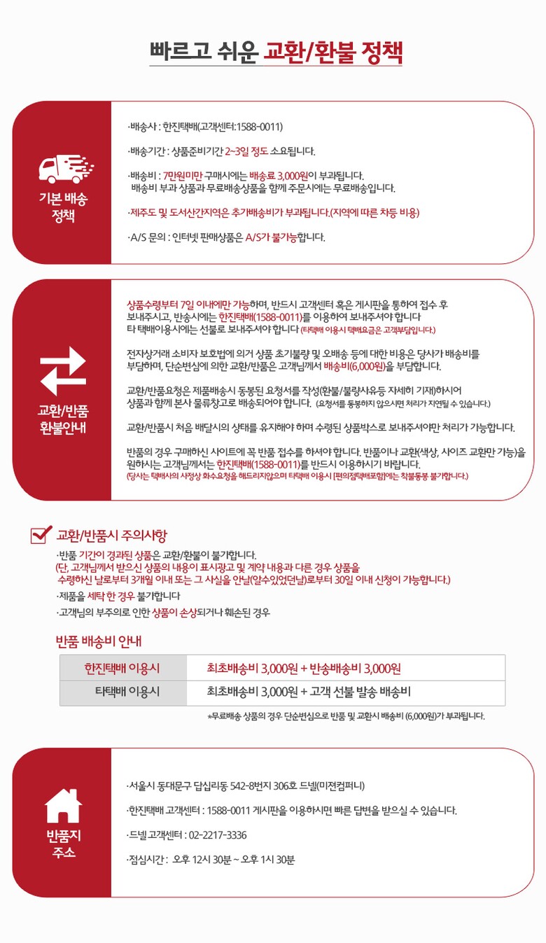 상품불량에 의한 반품, A/S, 품질보증 및 피해보상 등에 관한 사항은 소비자 분쟁해결기준(공정거래위원회 고시) 구매자가 미성년자인 경우에는 상품 구입시 법정대리인이 동의하지 아니하면 미성년자 본인 또는 법정대리인이 구매취소 할 수 있습니다. |