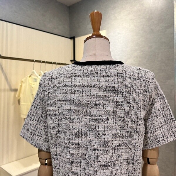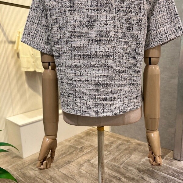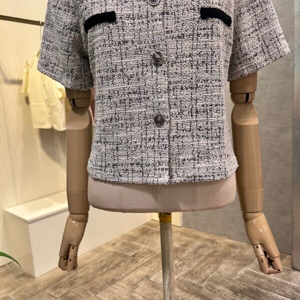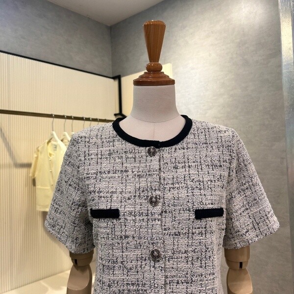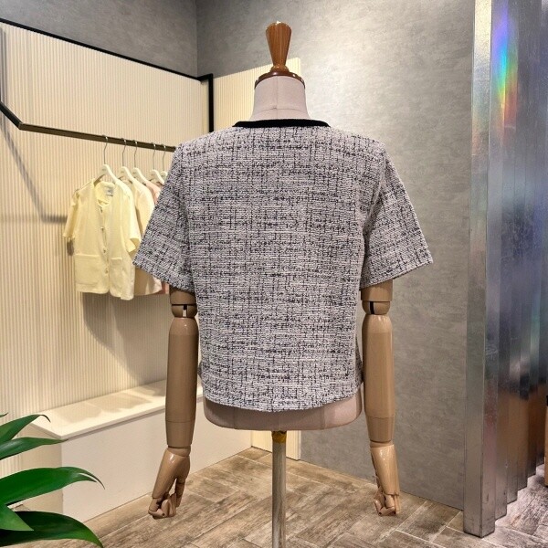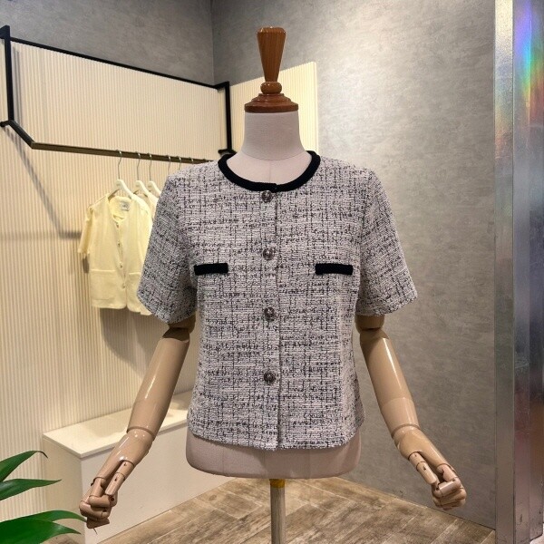 2025년 s/s 신상 크롭 배색 라운드 반팔 자켓?입니다. 여성스런 디자인으로 포인트 아이템 입니다.