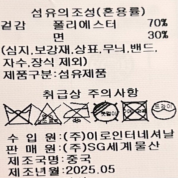 제품소재 : 겉감-폴리에스터70%, 면30%