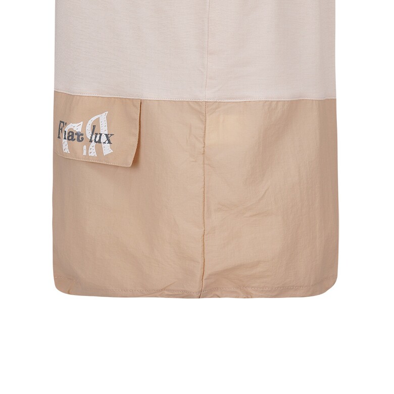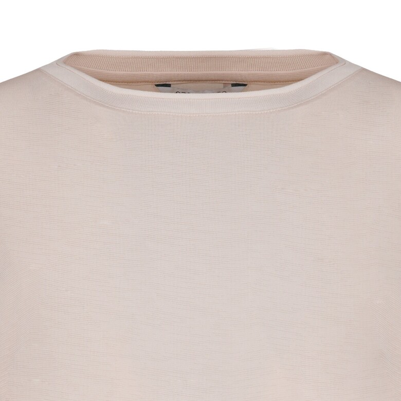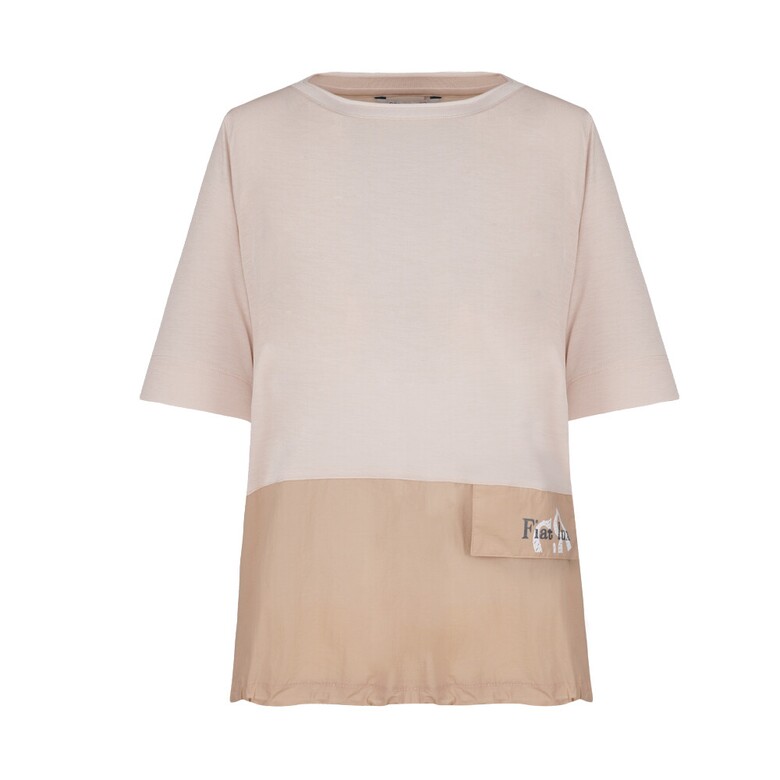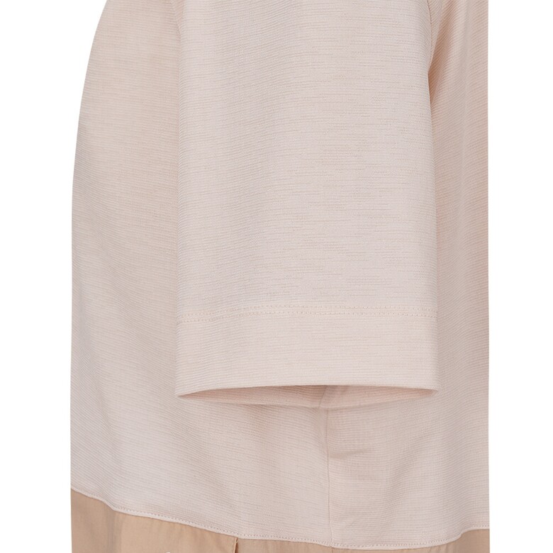 우븐 믹스 매치로 세련된 무드의 라운드 티셔츠입니다