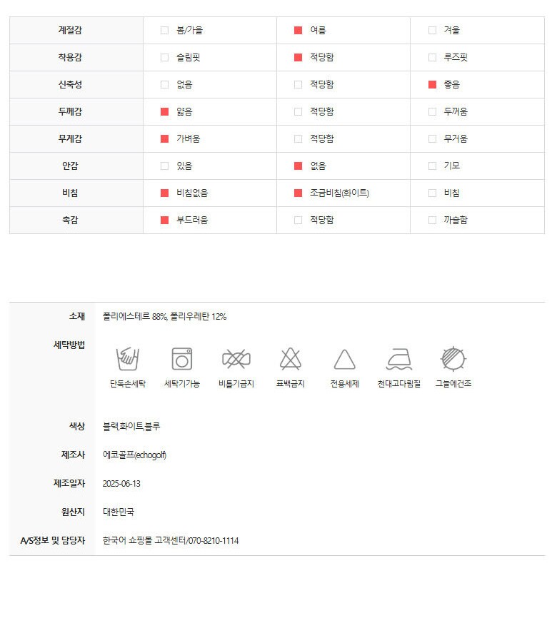 1. 제품 소재 (섬유의 조성 또는 혼용률을 백분율로 표시, 기능성인 경우 성적서 또는 허가서) | 상품 이미지 참조 |