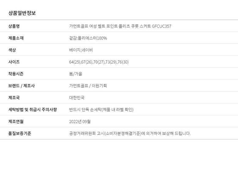 가먼트골프 여성 벨트 포인트 플리츠 큐롯 스커트 GFCUC357