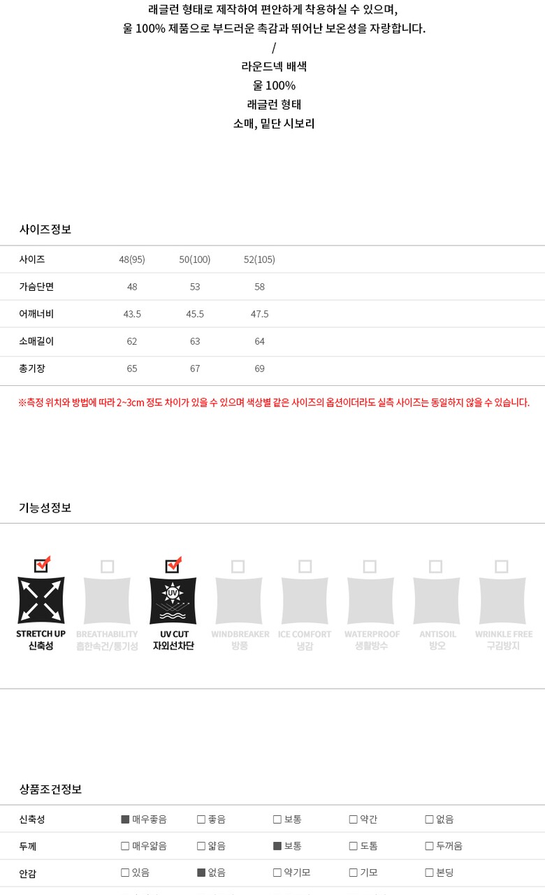 1. 제품 소재 (섬유의 조성 또는 혼용률을 백분율로 표시, 기능성인 경우 성적서 또는 허가서) | 겉감:양모100% |