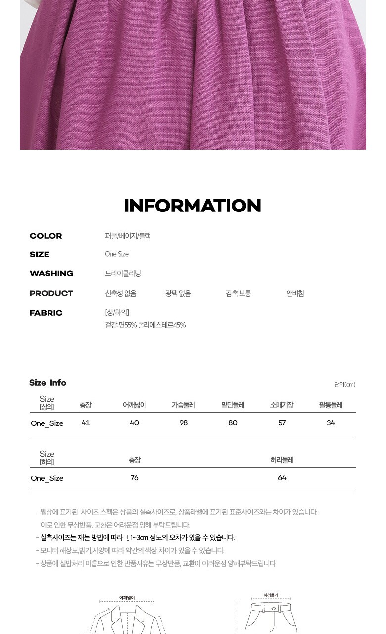 1. 제품 소재 (섬유의 조성 또는 혼용률을 백분율로 표시, 기능성인 경우 성적서 또는 허가서) | [상/하의] 겉감:면55% 폴리에스테르45% |
