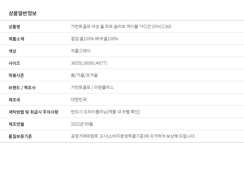| 1. 제품 소재 (섬유의 조성 또는 혼용률을 백분율로 표시, 기능성인 경우 성적서 또는 허가서) | 겉감:울100% 배색:울100% |