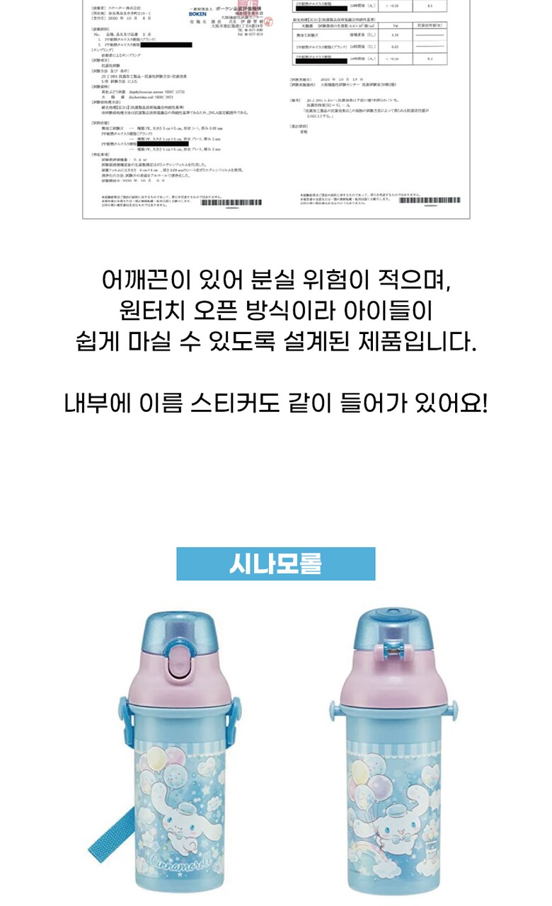 카밀리아 어린이집 원터치 물통 물병 유치원 초등 어깨끈 480ml 시나모롤 폼폼푸린 마이멜로디