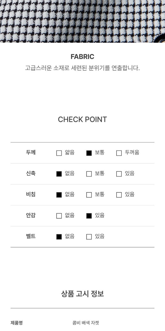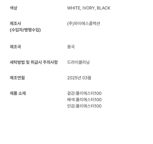 | 1. 제품 소재 (섬유의 조성 또는 혼용률을 백분율로 표시, 기능성인 경우 성적서 또는 허가서) | 상품상세참조 |