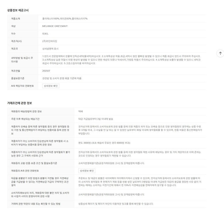 1. 제품 소재 (섬유의 조성 또는 혼용률을 백분율로 표시, 기능성인 경우 성적서 또는 허가서) 상품상세참조