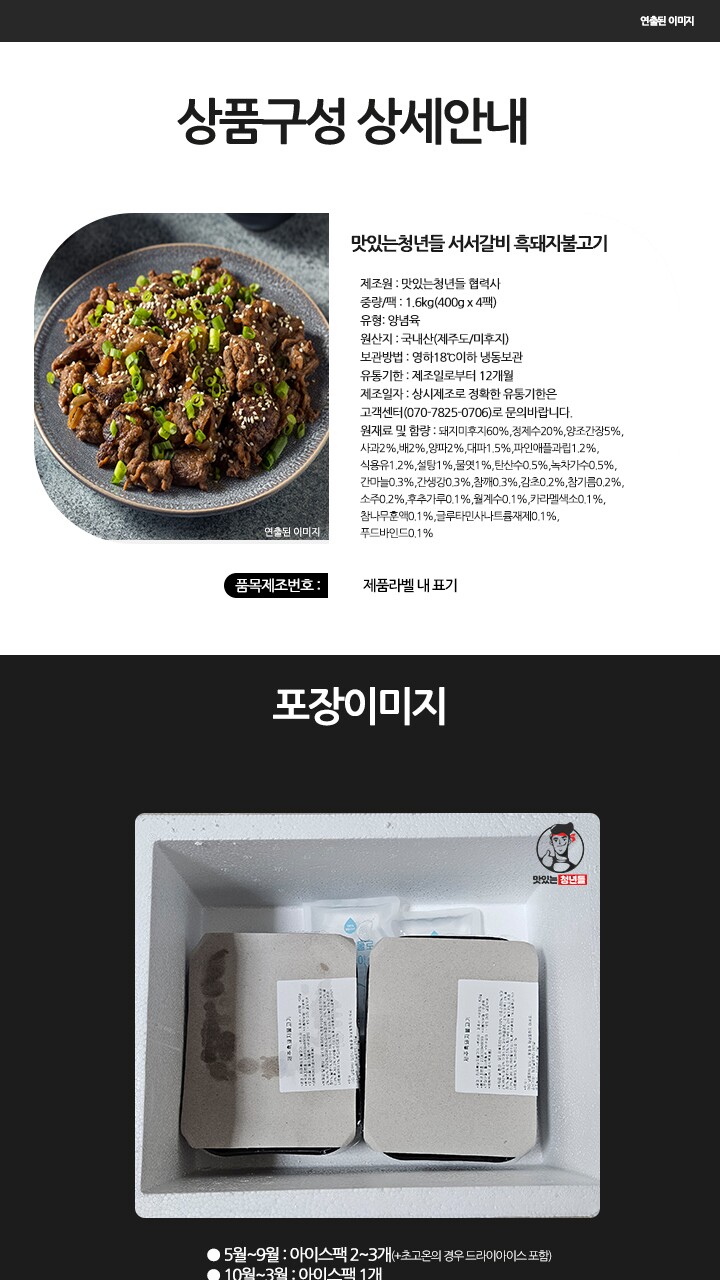 1. 포장단위별 용량(중량),수량,크기 맛있는청년들 서서갈비 흑돼지불고기 선물세트