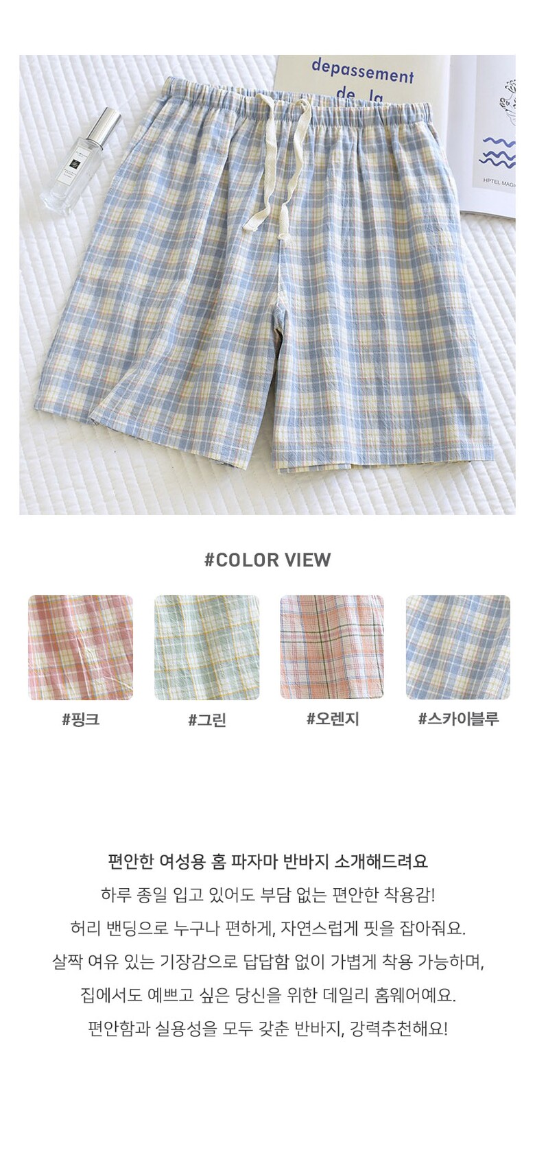 부드러운 파스텔톤 체크 린넨 잠옷 반바지