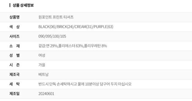 | 6. 세탁방법 및 취급시 주의사항 | 상품상세참조 |