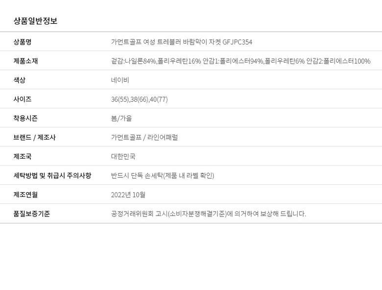 | 1. 제품 소재 (섬유의 조성 또는 혼용률을 백분율로 표시, 기능성인 경우 성적서 또는 허가서) | 겉감:나일론84%,폴리우레탄16% 안감1:폴리에스터94%,폴리우레탄6% 안감2:폴리에스터100% |