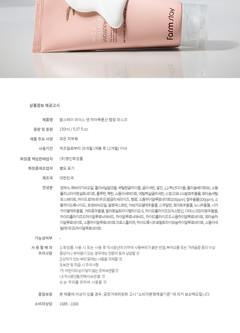 팜스테이 라이스 앤 히아루론산 랩핑 마스크 150ml