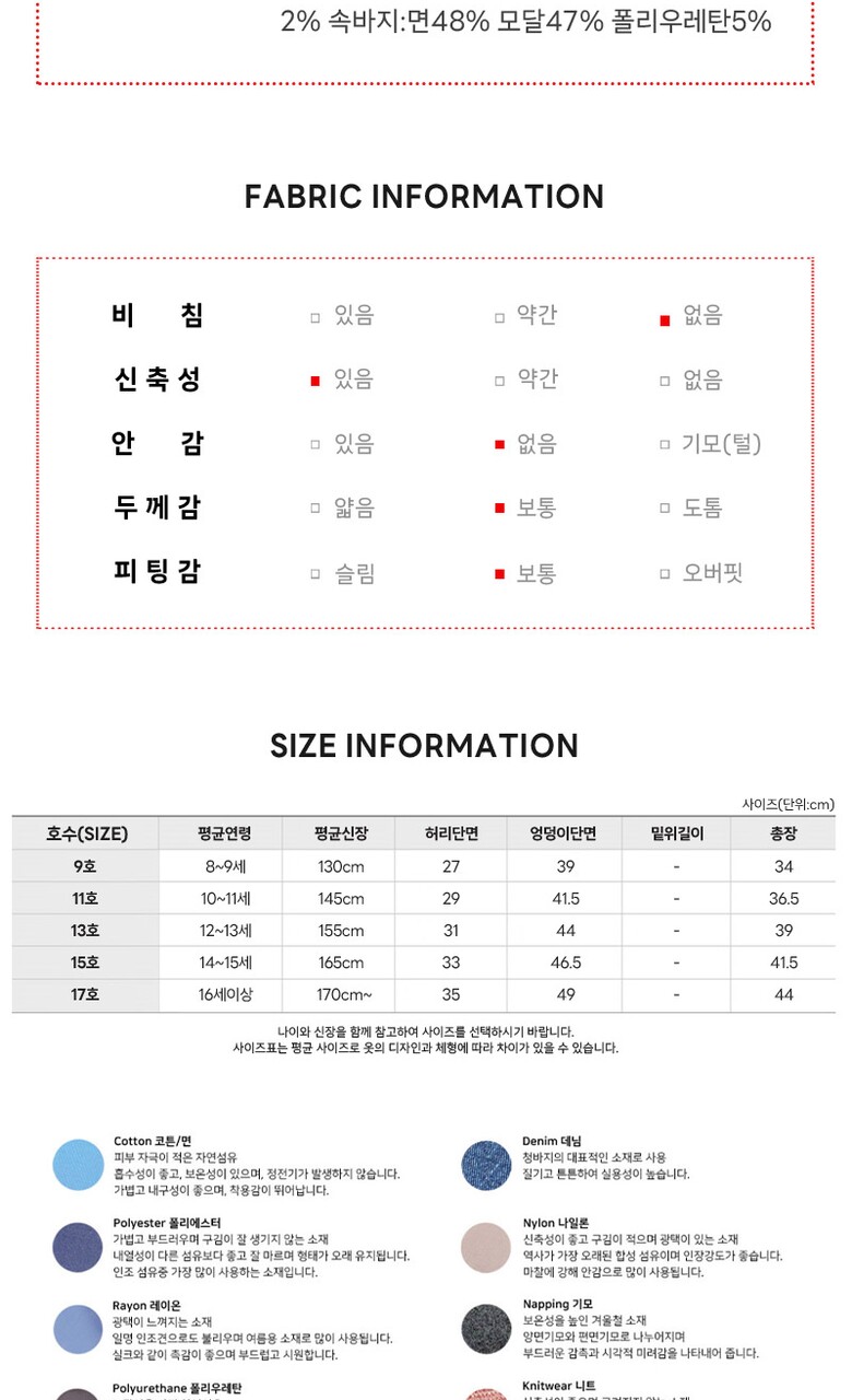 1. 제품 소재 (섬유의 조성 또는 혼용률을 백분율로 표시, 기능성인 경우 성적서 또는 허가서) | 겉감:폴리에스터68% 레이온30% 폴리우레탄2% 속바지:면48% 모달47% 폴리우레탄5% |