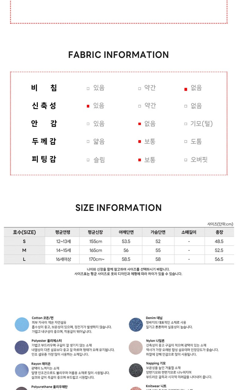 1. 제품 소재 (섬유의 조성 또는 혼용률을 백분율로 표시, 기능성인 경우 성적서 또는 허가서) | 겉감:면81% 폴리에스터19% |