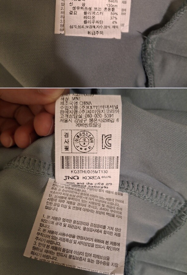 제품소재 : 겉감-폴리에스터59%, 레이온37%, 폴리우레탄4%
