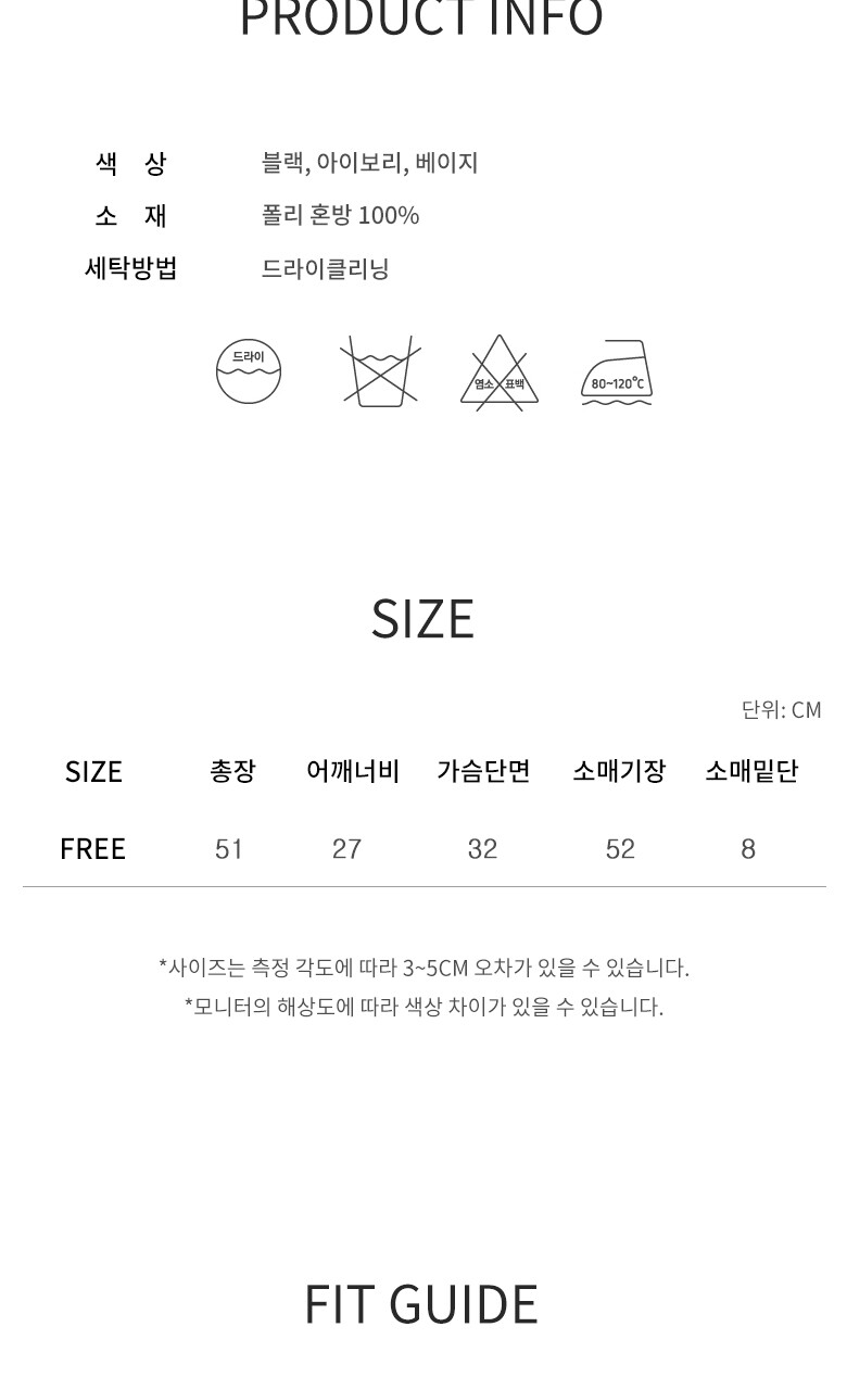 • 처음 배송된 상품상태와 다를 경우(세탁/착용 후 외출하신 경우) 반품이 불가합니다.