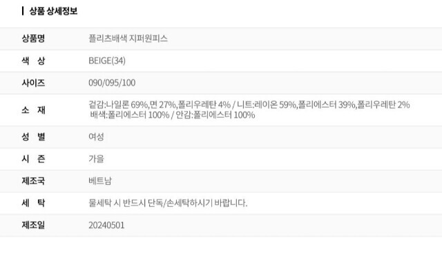 | 1. 제품 소재 (섬유의 조성 또는 혼용률을 백분율로 표시, 기능성인 경우 성적서 또는 허가서) | 상품상세참조 |