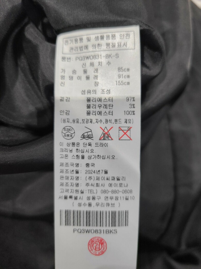 | 1. 제품 소재 (섬유의 조성 또는 혼용률을 백분율로 표시, 기능성인 경우 성적서 또는 허가서) | 폴리우레탄 3% / 안감:폴리에스테르 100% |