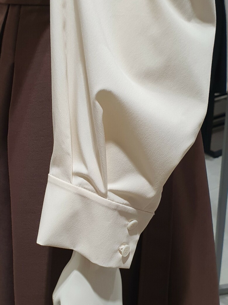 슬리브 배색과 A 라인 스커트가 페미닌한 실루엣을 연출하며