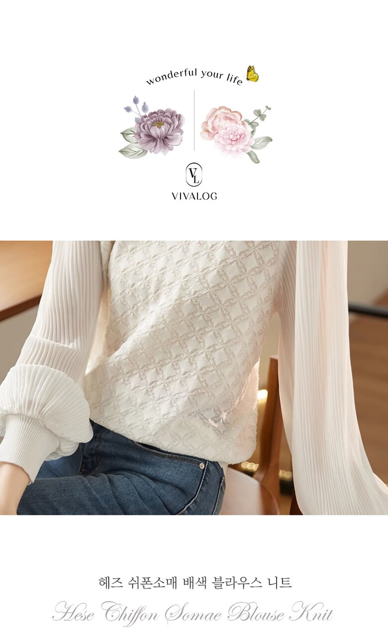 [비바로그] 헤즈 쉬폰소매 배색 블라우스 니트