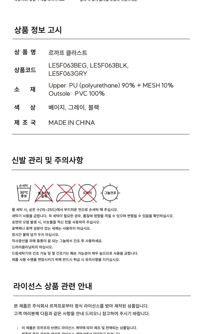 1. 제품 소재 (운동화인 경우에는 겉감, 안감을 구분하여 표시) | 상세페이지참조 |