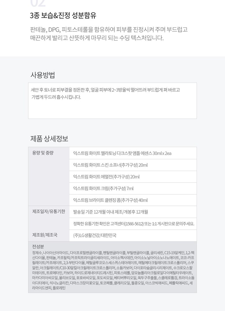 9. 사용 시 주의사항 | 1. 화장품을 사용 중 붉은 반점, 부어오름, 가려움증, 자극 등의 이상이 있는 경우, 적용 부위가 직사광선에 의하여 이상이 생긴 경우 사용을 중지하시고 피부과 전문의와 상담하세요. 2. 상처가 있는 부위, 습진 및 피부트러블 등의 이상이 있는 부위에는 사용하지 마세요. 3. 보관 및 취급시 주의사항 가)사용 후에는 반드시 마개를 닫아두세요. 나)유아ㆍ소아의 손이 닿지 않는 곳에 보관하세요. 다)고온 다습한 곳 및 직사광선 닿는 장소는 피해주세요. |
