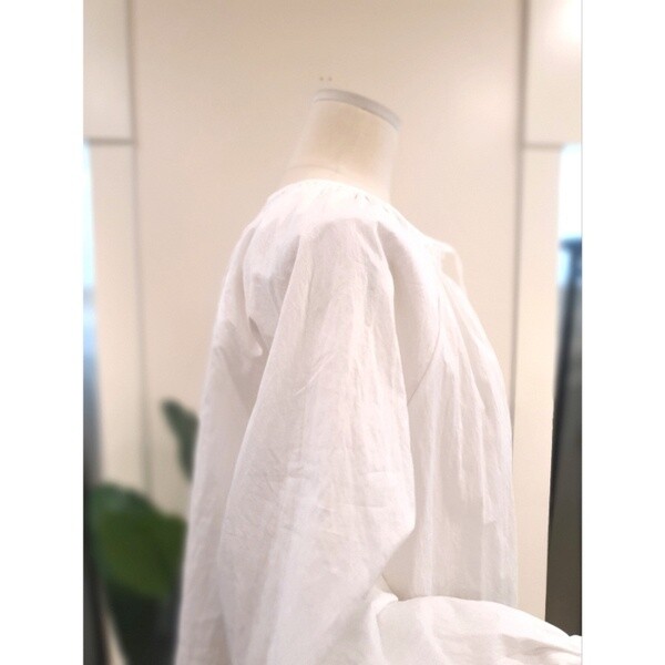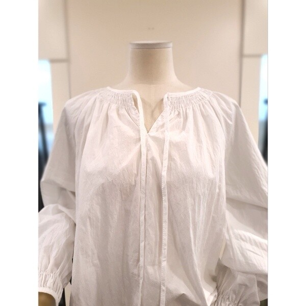 가벼운 셔링 노카라넥에 스트랩이 이어져있는 디자인으로 거추장스럽지 않습니다.스트랩을 묶어도 자연스럽게 흐르드록 두어도 이쁩니다.중앙 절개 포인트로 심심하지 않습니다.카라가 없어 목이 길어보이고 전체적인 핏은 뚝 떨어지는 아방한 핏으로 편안합니다.소매 셔링에 밴딩입니다.