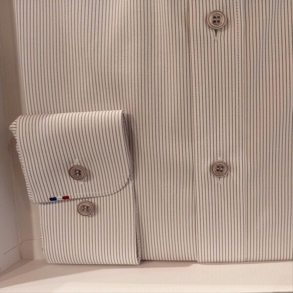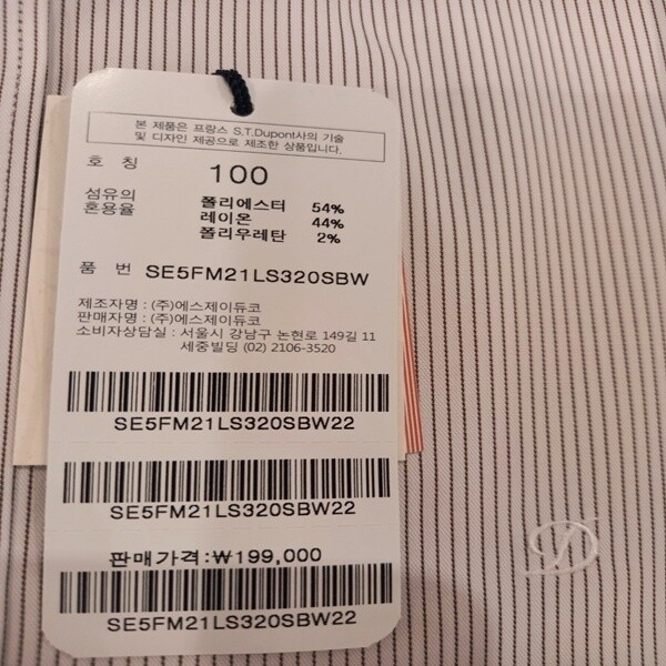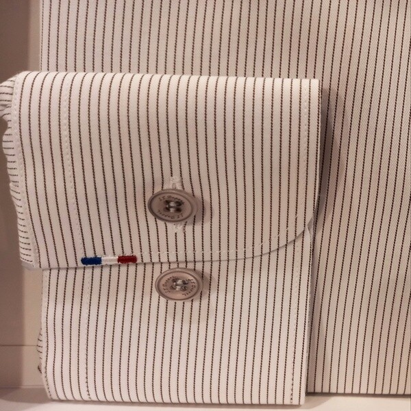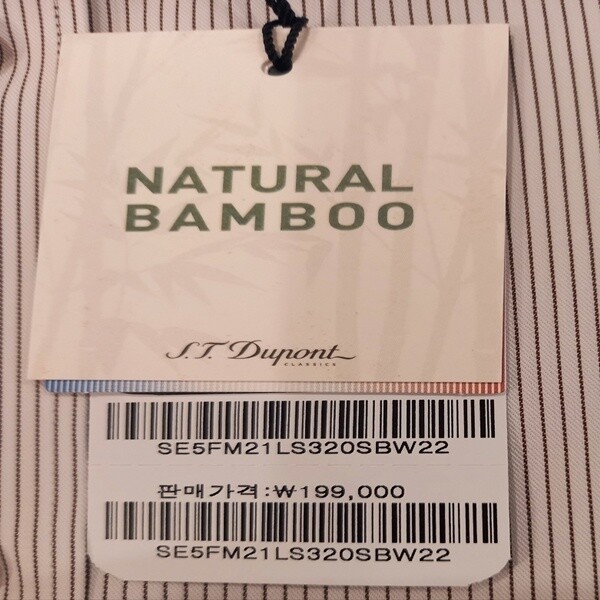 BAMBOO(대나무)소재를 사용한 폴리에스터레이온 스판 혼방 소재로 찰랑거리고, 터치감이 좋은 핀 스트라이프 패턴의 제품입니다 오른쪽 커프스의 듀퐁만의 시그니처인 삼색자수를 수놓은 컴포터블 제품입니다.