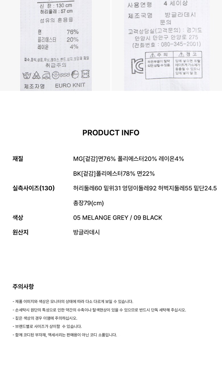 1. 제품 소재 (섬유의 조성 또는 혼용률을 백분율로 표시, 기능성인 경우 성적서 또는 허가서) | MG[겉감]면76% 폴리에스터20% 레이온4% BK[겉감]폴리에스터78% 면22% |