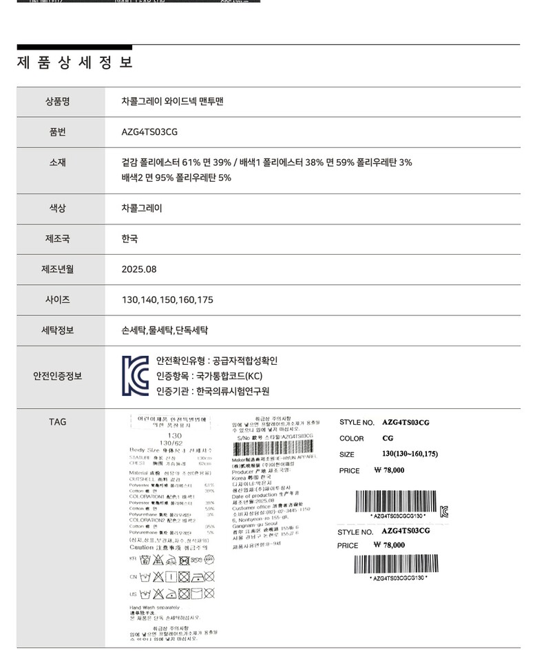 제품소재 : 겉감 폴리에스터 61% 면 39% / 배색1 폴리에스터 38% 면 59% 폴리우레탄 3% / 배색2 면 95% 폴리우레탄 5%
