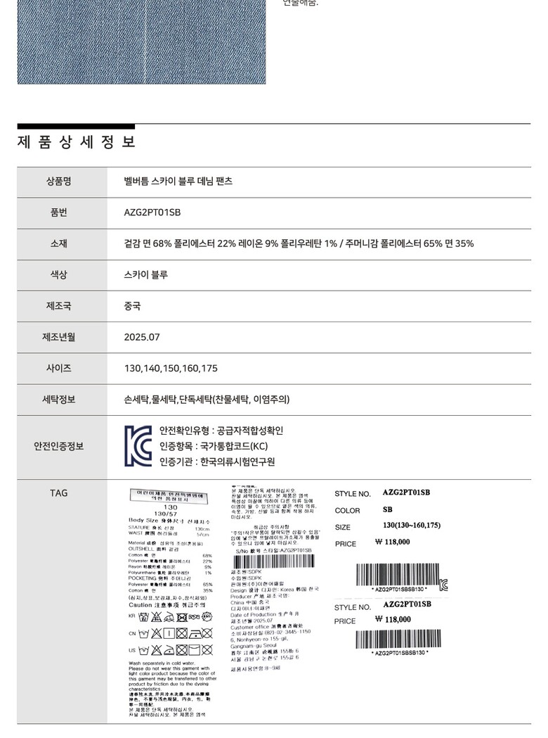 품명 및 모델명 : AZG2PT01SB 벨버틈 스카이 블루 데님 팬츠